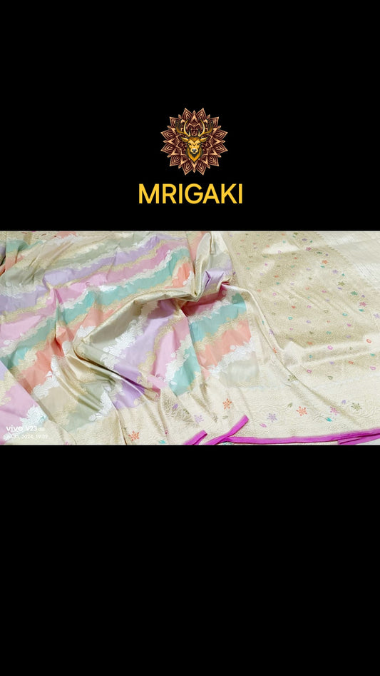 (Only on Pre-Order) Pure Katan Silk Handloom Light colors combo Laheriya pattern Rangkat Banarasi Saree with Minakari work on borders & pallu