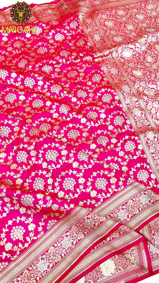 (Only on Pre-Order) Pure Katan Silk Handloom Sona Rupa Jangla Banarasi Saree in Rani Pink base color
