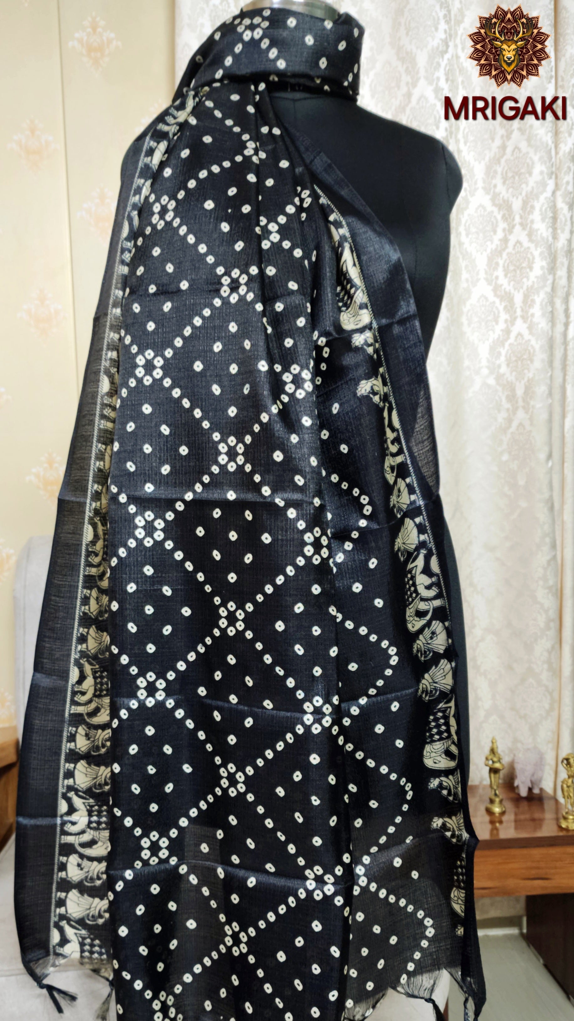 Picture a chic Khadi silk fabric adorned with classic polka dots in sophisticated black and cream tones. Enhanced with a Raj-gharana border featuring digital print art, this versatile piece doubles as a stylish Stole or elegant dupatta, blending modern design with timeless charm for a graceful addition to any ensemble.