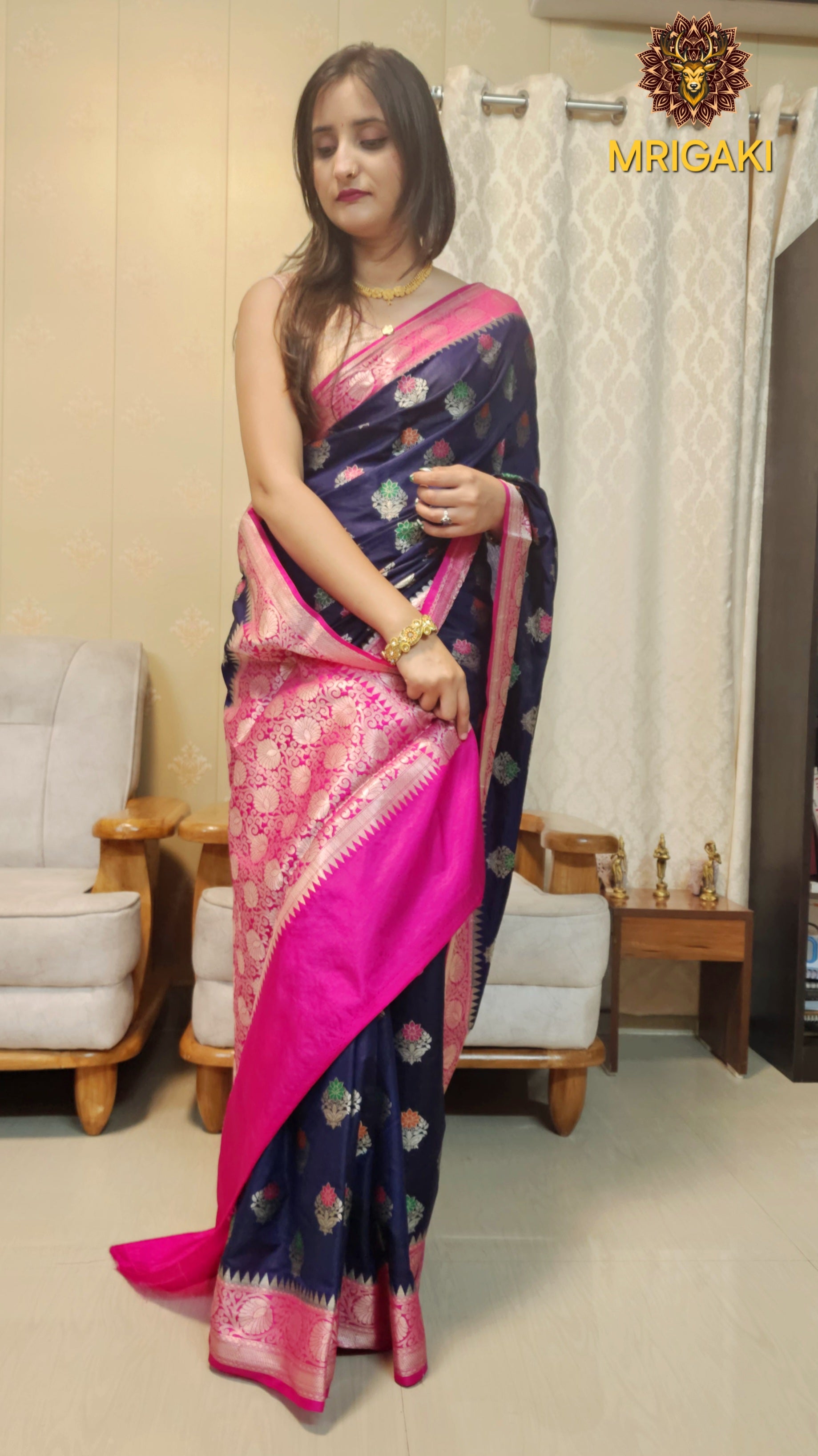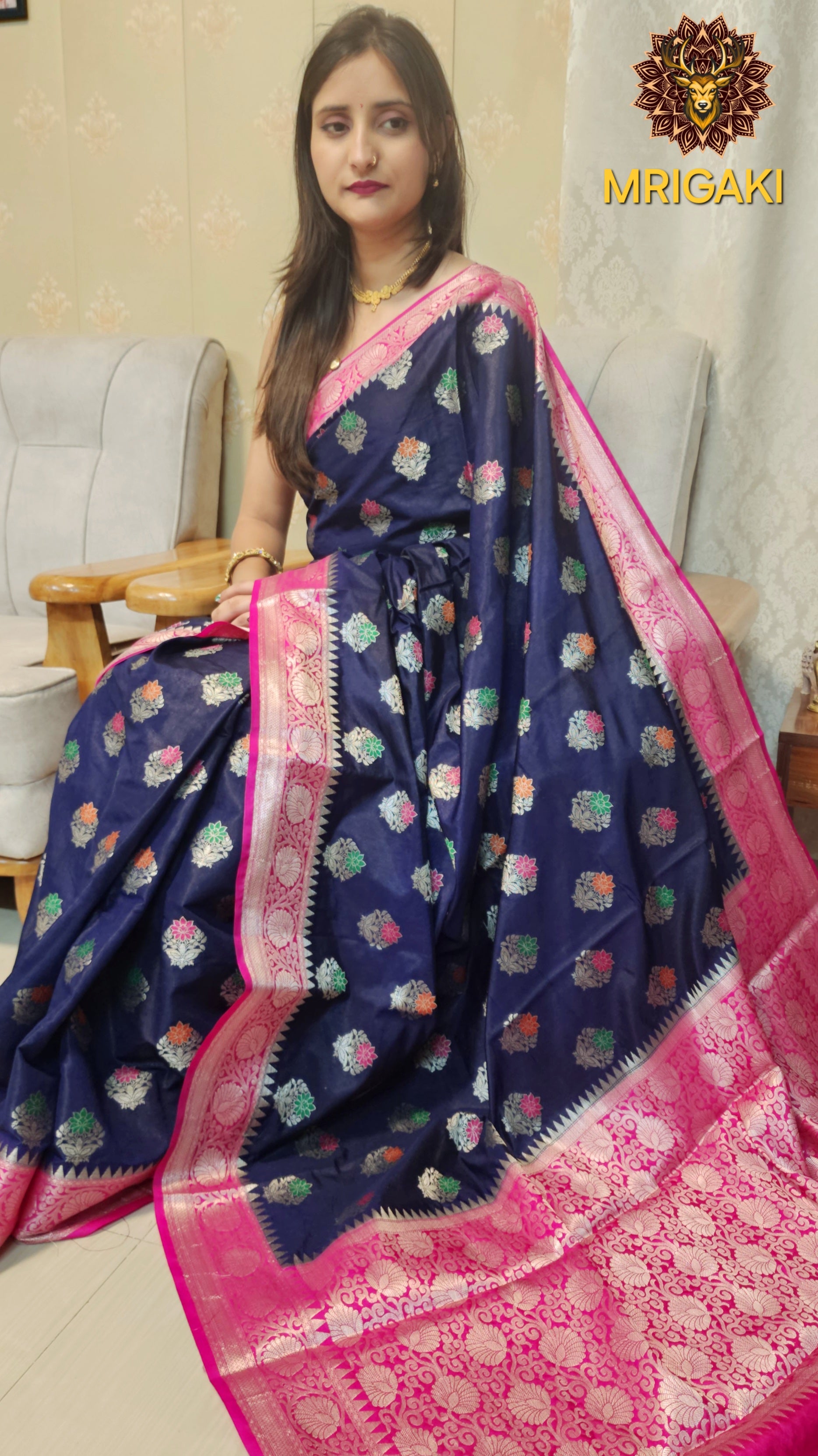 Royal Blue Dupion Silk Saree with Multi-color Minakari & Pink contrast border