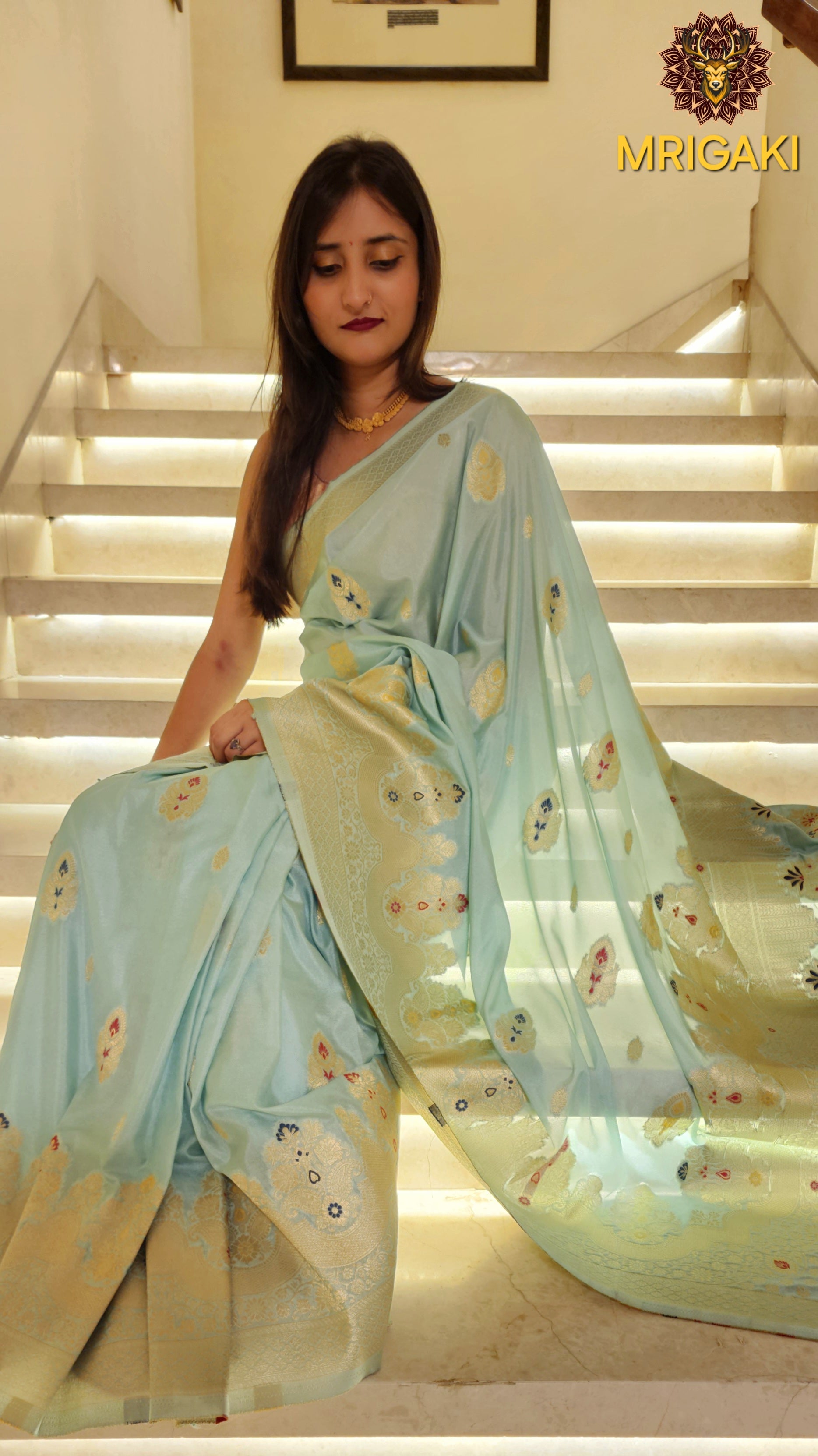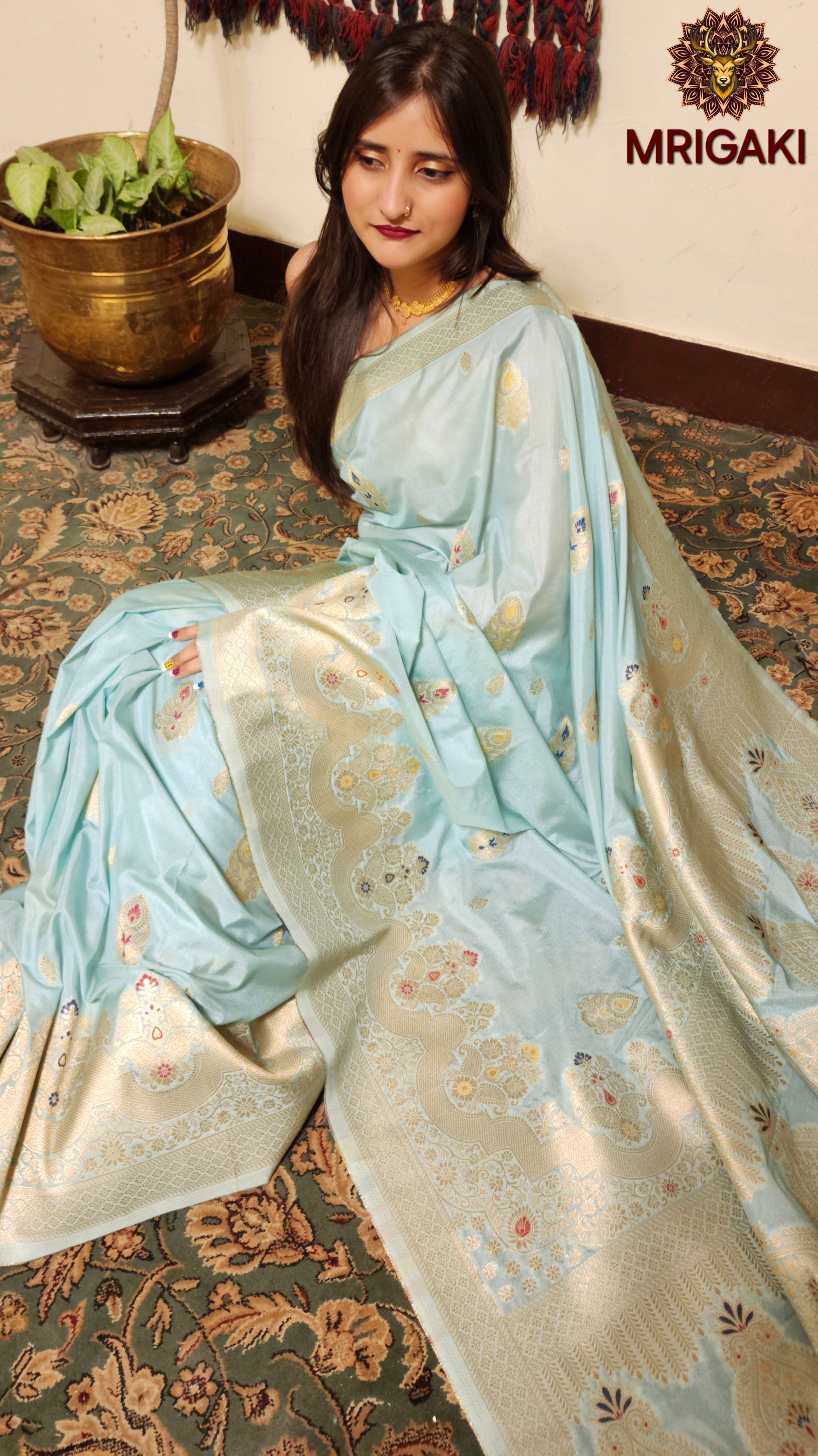 Sky Blue Pure Silk Georgette Banarasi Saree with Handwoven Multi-color Minakaari work
